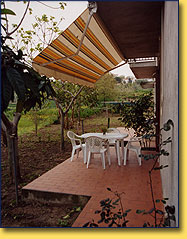 Die Terrasse liegt idyllisch unter einem Feigenbaum (können im Sommer gerne geerntet werden), im Wind klingt das Rauschen der Bananenstauden wie Regen, und Mispel-, Granatapfel-, und Kakibäume, sowie Weinreben, Rosen, Passionsblumen und ein enormer Rosmarinbusch zaubern eine tropische Atmosphäre.